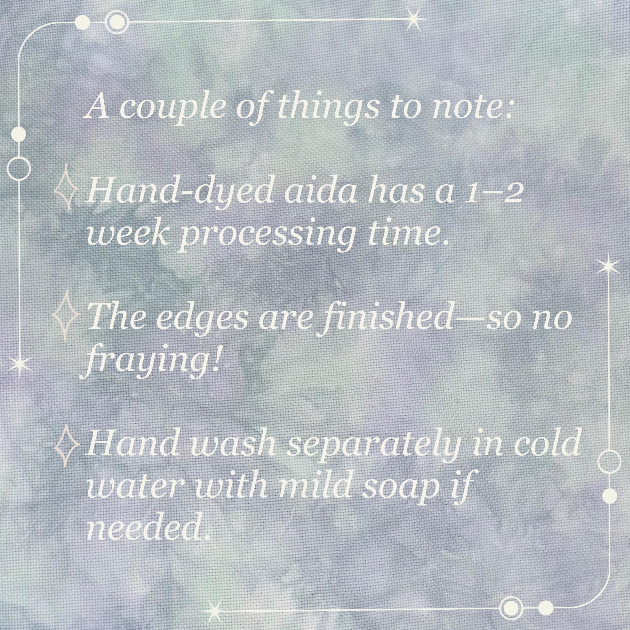 This listing is for MADE TO ORDER dyed Aida, with a 1-2 week processing time. By purchasing, you agree to this processing time. No Cancellations.